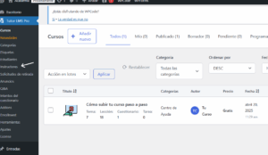 Vista como administrador, la flecha apunta al menú de wordpress, dentro de Tutor LMS, hacer click en Instructores. Allí podrás ver cuanto es el valor que le corresponde ese mes según sus ventas.