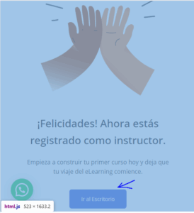 Panel de instructor, en menú, login, se despliega registro de instructor, haces click alli. Si estás logueado verás este cartel. Haz click en escritorio.